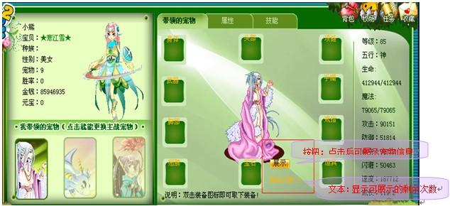 2、弹出宠物资料界面,主宠界面新添加“宠物展示”按钮。(如图)