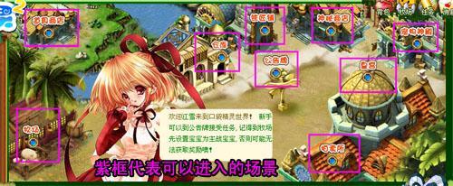 点击后”主功能显示区”会显示城镇大地图,你可以在城镇地图上的选择任意一个场景进入相应的界面。.