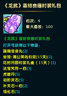 活动介绍: 进入本次新服的玩家,将享受情人节专属福利,上线即可领取《龙武》喜结良缘礼包一份!精美花好月圆时装、珍贵蒲公英的约定坐骑人人有份!