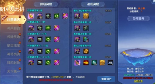 1、问鼎通天:开服第1-2天开启,按照玩家通关通天塔进度以及通关最高数的时间的先后进行排名发奖;