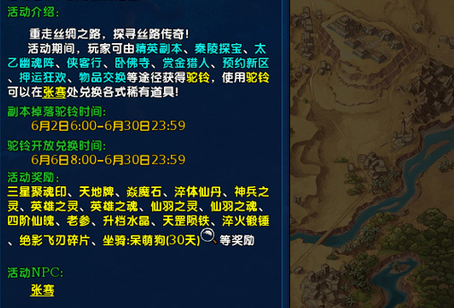 活动说明:重走丝绸之路,探寻丝路传奇!活动期间,玩家可由精英副本、秦陵探宝、太乙幽魂阵、侠客行、卧佛寺、赏金猎人、预约新区押运狂欢、物品交换等途径获得驼铃,使用驼铃可以在张骞处兑换各式稀有道具!