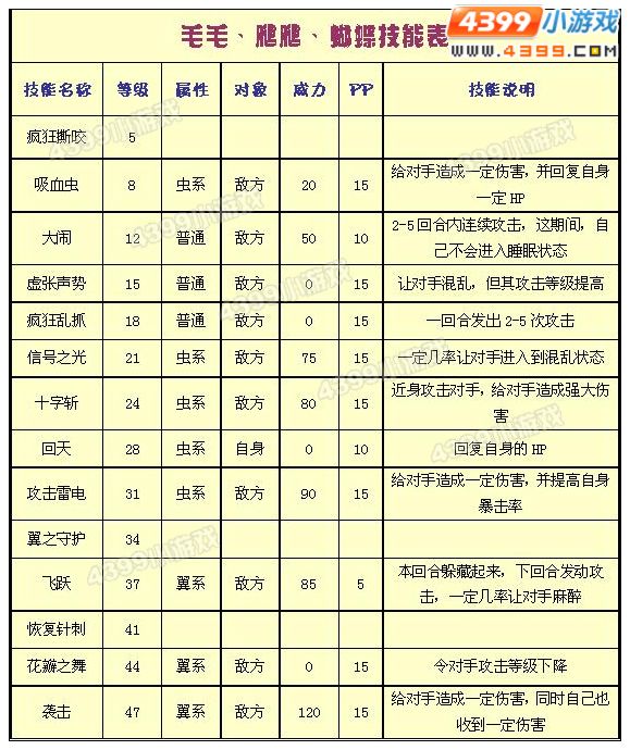 洛克王国毛毛/爬爬/蝴蝶 种族值 进化图 技能表
