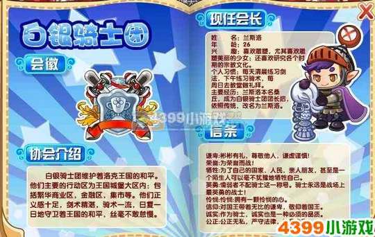 白银骑士团维护着洛克王国的和平。他们主要的行动区为王国城堡大区内,包括繁华商业区,金融区,集市等。他们正义感十足,剑术精湛,骑术一流,日复一日地守卫着王国的和平,丝毫不敢怠慢。
