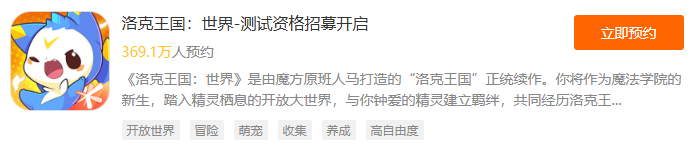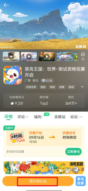 4、点击进入游戏页面后,点击下方【预约】按钮可关注预约《洛克王国:世界》,当游戏开放下载测试时,游戏盒会第一时间通知到大家!