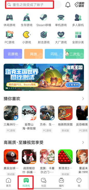 3、点击下方导航中的【找游戏】,在顶部搜索栏中输入“洛克王国”,就可以找到洛克王国手游了