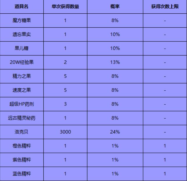 每位小洛克在本次活动期间最多可获得1次蓝/橙/紫色精粹,获得后对应奖励概率调整至洛克贝。