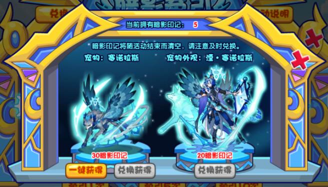 消耗30个暗影印记可兑换获得宠物:赛诺拉斯,消耗20个暗影印记可兑换获得宠物外观:湮·赛诺拉斯。暗影印记将随活动结束而清空,请小洛克注意及时兑换。其中宠物外观湮·赛诺拉斯需要在获得宠物后才可使用,活动结束后不会进入商城。