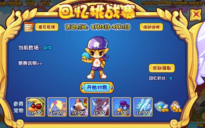 回忆挑战赛的开启时间为8月15日-9月11日。各位小洛克需要准备6只满级的宠物,同时,在这个模式下,仅可携带序号1-1700的宠物进行参赛,对装备和守护兽没有限制要求,这一点与天梯赛和系别赛相同。