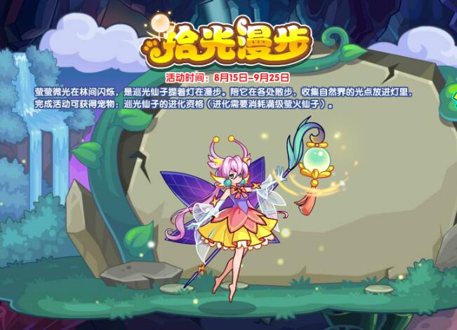 萤萤微光在林间闪烁,是巡光仙子提着灯在漫步。陪它在各处散步,收集自然界的光点放进灯里,完成活动可获得宠物:巡光仙子的进化资格(进化需要消耗满级萤火仙子)。