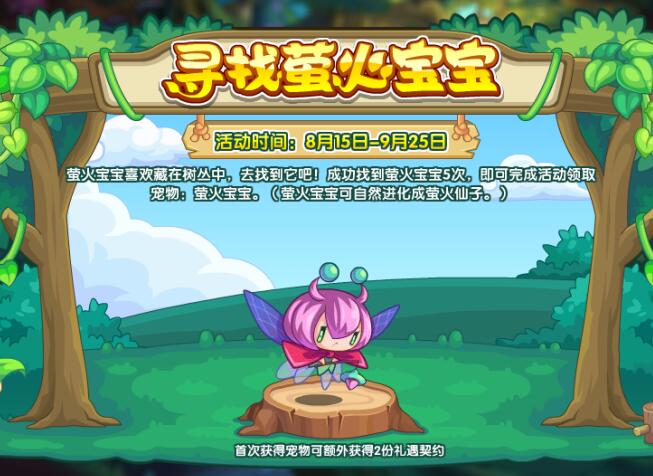 萤火宝宝喜欢藏在树丛中,去找到它吧!成功找到萤火宝宝5次,即可完成活动领取宠物:萤火宝宝。(萤火宝宝可自然进化成萤火仙子)