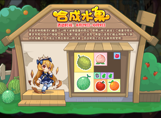 贪吃的学院精灵们偷吃了山姆大叔果园里的西瓜,惹得山姆大叔找上了格里芬院长,要求学院对他进行赔偿。院长无奈只能找上小洛克,希望小洛克们能运用到刚学习到的合成魔法,合成出大西瓜赔给山姆大叔!活动完成之后可兑换学院宠物!