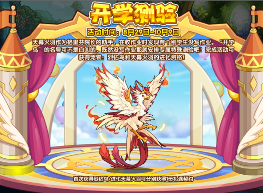 天幕火羽作为格里芬院长的助手,在收作业时发现有个别学生没写作业。“开学鸟”的名号可不是白叫的,既然没写作业那就安排专属特殊测验吧!完成活动可获得宠物:烈钻鸟和天幕火羽的进化资格!