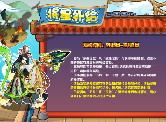 再来看看活动吧!在将星版本中,各位小洛克需要从赤壁之战、战船之间等活动中,获得补给点数,提升将星补给等级,即可解锁获得五铢或玉璧,在补给商店中兑换丰厚奖励哦!喜欢将星系列宠物的小洛克可千万不要错过啦!