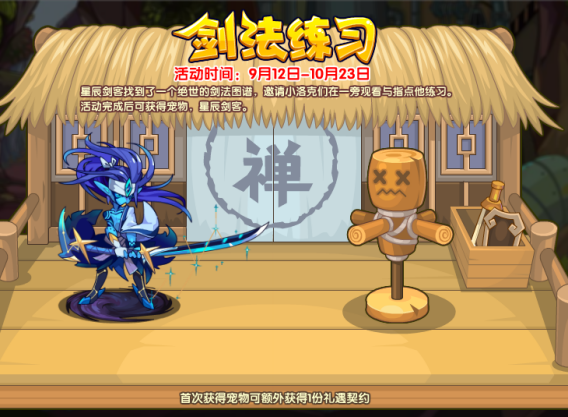 星辰剑客找到了一个绝世的剑法图谱,邀请小洛克们在一旁观看与指点他练习。活动完成后可获得宠物,星辰剑客。