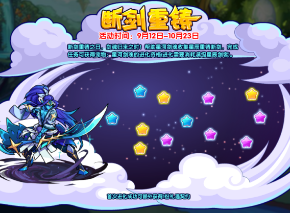 断剑重铸之日,剑魂归来之时!帮助星河剑魂收集星辰重铸断剑,完成任务可获得宠物:星河剑魂的进化资格(进化需要消耗满级星辰剑客)。