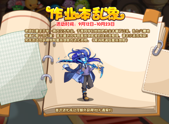 老师们要求开学一周内交齐作业,于是同学们纷纷把作业本塞了过来,乱七八糟地堆满了整个办公室!落在最后的学院星辰剑客被抓住负责整理,请求小洛克帮助!完成活动可获得学院星辰剑客的进化资格。(需消耗满级星辰剑客)