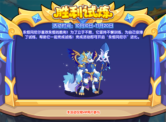 永恒冈尼尔喜欢永恒的胜利!为了立于不败,它坚持不懈训练,为自己安排了试炼,帮助它一起完成试炼!完成活动即可开启“永恒冈尼尔”进化。(本活动仅限VIP用户参与)