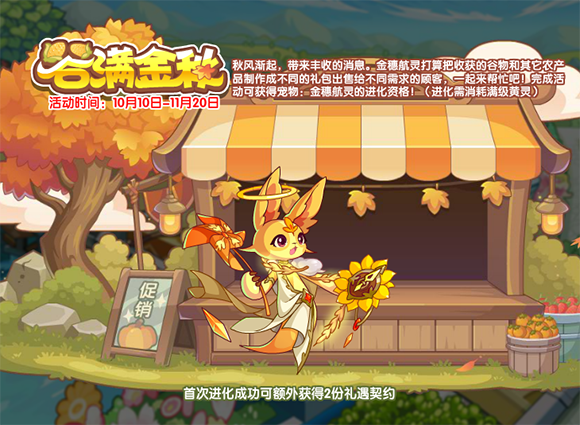秋风渐起,带来丰收的消息。金穗航灵打算把收获的谷物和其它农产品制作成不同的礼包出售给不同需求的顾客,一起来帮忙吧!完成活动可获得宠物:金穗航灵的进化资格!(进化需消耗满级黄灵)