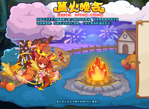 炽焰丰灵正在为搭建篝火缺少原材料而苦恼,快来帮助她完成任务可获得宠物:炽焰丰灵的进化资格。(进化需消耗满级赤灵)