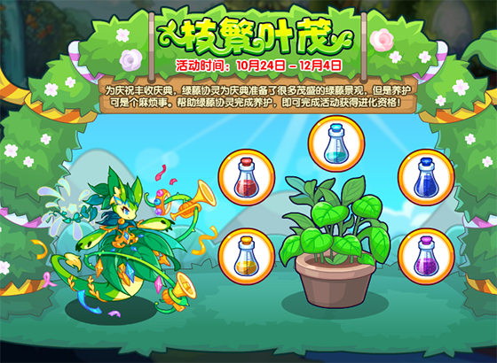 再来看看活动!为庆祝丰收庆典,绿藤协灵准备了很多茂盛的绿藤景观,但是养护可是个麻烦事。帮助绿藤协灵完成养护,即可完成活动获得进化资格哦!