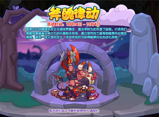 暗黑托伦因情绪失控正在满世界暴走,魔法学院为此伤透了脑筋。小洛克们需要带着具备安神之力的乐器前往现场,通过音符的力量帮助暗黑托伦稳住情绪,避免一场灾难的发生。活动完成后可获得暗黑托伦的进化资格!