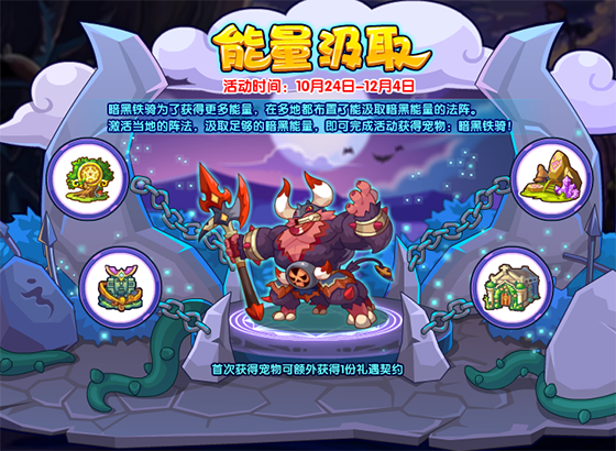 暗黑铁骑为了获得更多能量,在多地都布置了能汲取暗黑能量的法阵。激活当地的阵法,汲取足够的暗黑能量,即可完成活动获得宠物:暗黑铁骑!
