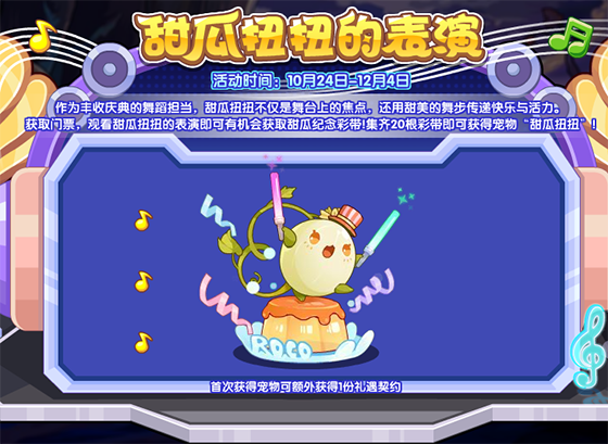 作为丰收庆典的舞蹈担当,甜瓜扭扭不仅是舞台上的焦点,还用甜美的舞步传递快乐与活力。获取门票,观看甜瓜扭扭的表演即可有机会获取甜瓜纪念彩带!集齐20根彩带即可获得宠物“甜瓜扭扭”!