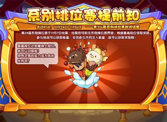 第24届系别排位赛于11月7日结算,结算后可前往系别排位赛界面,根据最高段位领取奖励。参与挑战可以获取能量,全民参与共同注入能量,就可以获取奖励哦!