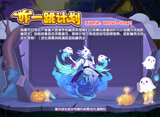 捣蛋节日将近,准备大显身手的幽灵系宠物们已将精心准备的吓人计划提交给蓝影幽灵主。协助征集各位评委意见,审核计划,完成活动可获得宠物:蓝影幽灵主的进化资格!(进化需要消耗满级蓝焰幽灵主)