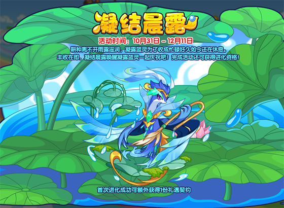 耕种离不开雨露滋润,凝露蓝灵为了收成忙碌好久如今还在休息。丰收在即,凝结晨露唤醒凝露蓝灵一起庆祝吧!完成活动还可获得进化资格!