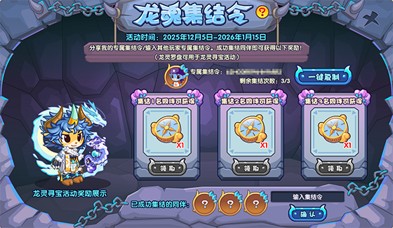 分享我的专属集结令/输入其他玩家专属集结令。成功集结同伴即可获得以下奖励!(龙灵罗盘可用于龙灵寻宝活动)