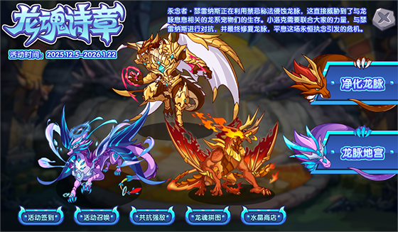 参与“净化龙脉”“龙脉迷宫”等主要活动玩法获取永恒水晶,并于水晶商店兑换主要活动奖励,并可通过“龙魂馈礼”“龙魂集结令”“共抗强敌”“龙魂拼图”等功能解锁额外活动奖励。