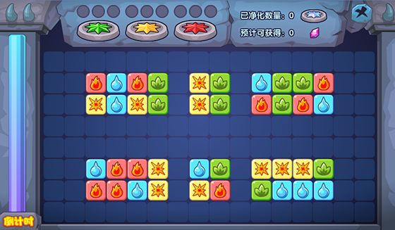 游戏中,法阵的颜色表示其属性,需要消除3对相应属性的方块,才能净化该法阵。