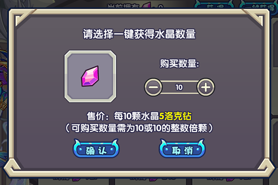 每10颗水晶售价为5洛克钻,可购买数量需为10或10的整数倍颗水晶。