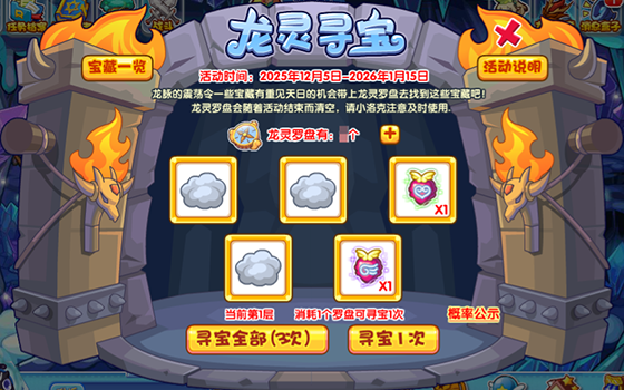 龙灵寻宝活动顾名思义就是要去寻找宝藏!点击【寻宝1次】或者【寻宝全部】消耗一定数量龙灵罗盘即可获得宝藏或者培养果实。