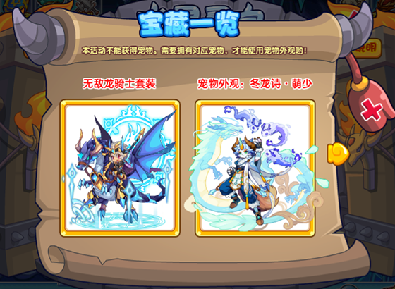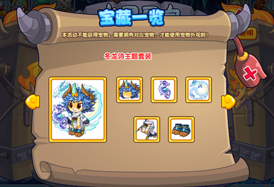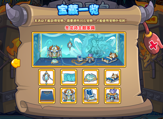 点击【宝藏一览】就可以看到所有宝藏,而且当前已经获得了哪些宝藏也会有相应标注。其中冬龙诗·萌少为宠物外观,需要拥有华魇萌少才可使用,没有华魇萌少的小洛克可以前往趣味对弈活动进行获得哟!