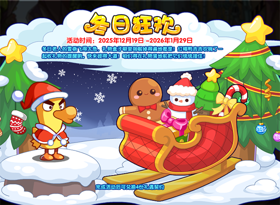 再来看看活动!红帽鸭吉吉、袜兜兜等萌宠回归啦!快来彼得大道,在礼物落地之前将它们通通接住,获得冬日礼物积分,积分可用来兑换宠物和礼遇契约奖励哦!