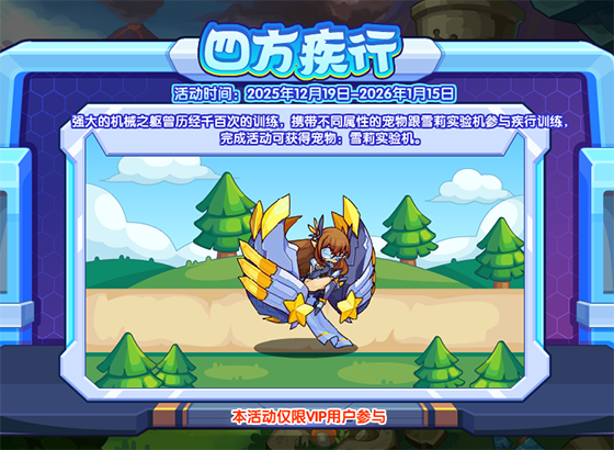 强大的机械之躯曾历经千百次的训练,携带不同属性的宠物跟雪莉实验机参与疾行训练,完成活动可获得宠物:雪莉实验机。本活动仅限VIP用户参与。