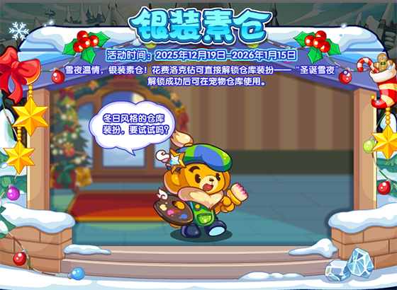 雪夜温情,银装素仓!花费洛克钻可直接解锁仓库装扮——“圣诞雪夜”。解锁成功后可在宠物仓库使用。