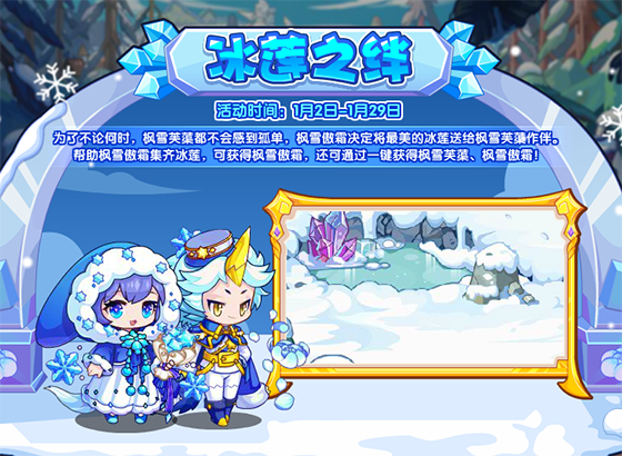 为了不论何时,枫雪芙蕖都不会感到孤单,枫雪傲霜决定将最美的冰莲送给枫雪芙蕖作伴。帮助枫雪傲霜集齐冰莲,可获得枫雪傲霜,还可通过一键获得枫雪芙蕖、枫雪傲霜!