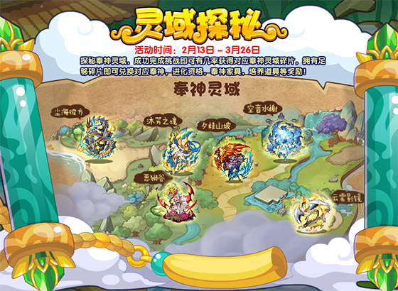 探秘奉神灵域,成功完成挑战即可有几率获得对应奉神灵域碎片,拥有足够碎片即可兑换对应奉神灵兽,进化资格,奉神家具,培养道具等奖励!
