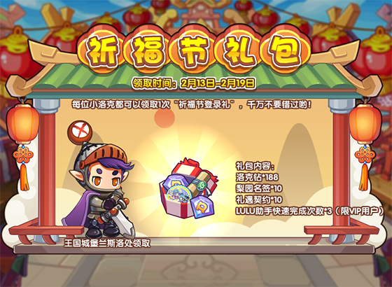 2月13日-2月19日时间段内,登录游戏到王国城堡-兰斯洛处即可领取“祈福节登录礼”。
