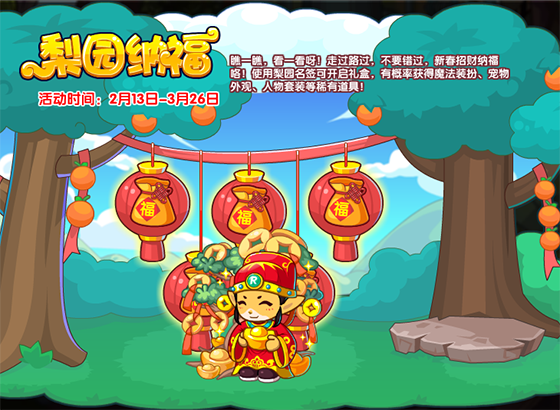 瞧一瞧,看一看呀!走过路过,不要错过,新春招财纳福咯!使用梨园名签可开启礼盒,有概率获得魔法装扮、宠物外观、人物套装等稀有道具!