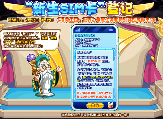 请持有“新生SIM卡”的小洛克到教学楼-格里芬院长处进行登记!完成登记的小洛克,将可以在《洛克王国:世界》正式上线后,通过已完成登记的QQ号登录《洛克王国:世界》游戏,通过游戏内邮件领取专属任务和特别奖励!登记需消耗道具:新生SIM卡,每位小洛克仅可完成1次登记。