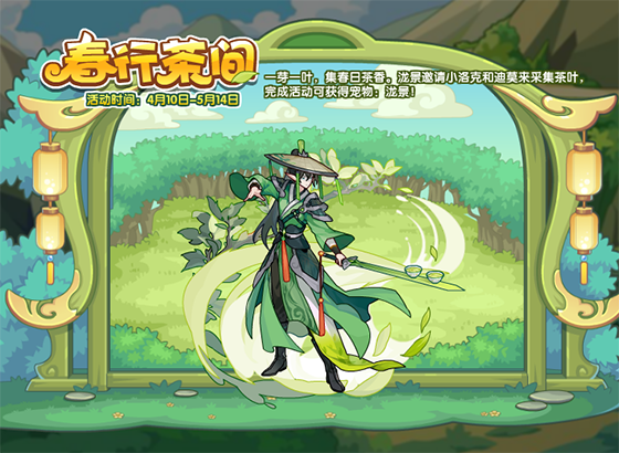再来看看活动吧!百茶回甘主题宠物——泷景,即将正式与各位小洛克见面!一芽一叶,集春日茶香。泷景邀请小洛克和迪莫来采集茶叶,完成活动可获得宠物:泷景!