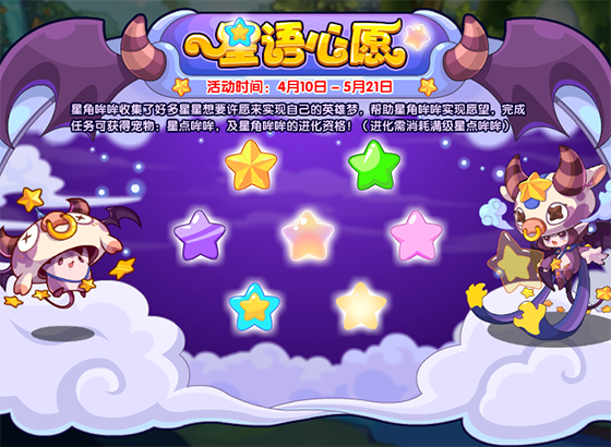 星角哞哞收集了好多星星想要许愿来实现自己的英雄梦,帮助星角哞哞实现愿望,完成任务可获得宠物:星点哞哞,及星角哞哞的进化资格!(进化需消耗满级星点哞哞)