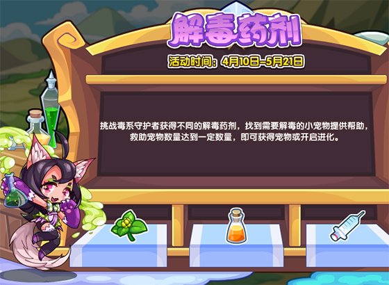挑战毒系守护者可获得不同的解毒药剂,找到需要解毒的小宠物提供帮助,救助宠物数量达到一定数量,即可获得宠物或开启进化。