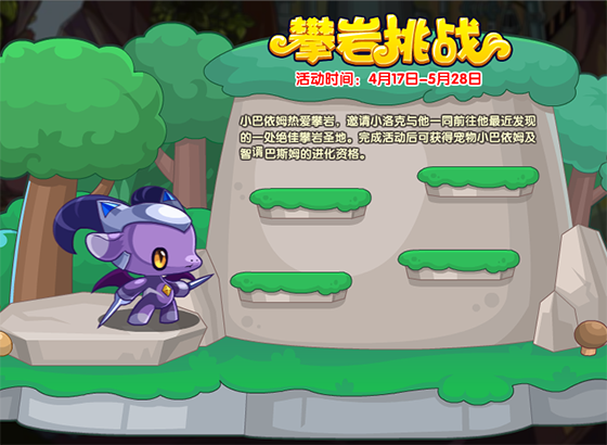小巴依姆热爱攀岩,邀请小洛克与他一同前往他最近发现的一处新的绝佳攀岩圣地。完成活动后可获得宠物小巴依姆及智谞巴斯姆的进化资格。