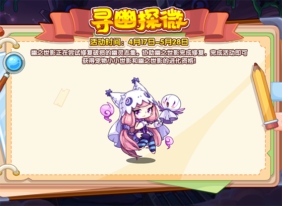 幽之世影正在尝试修复破损的幽灵志集。协助幽之世影完成修复,完成活动即可获得宠物小小世影和幽之世影的进化资格!