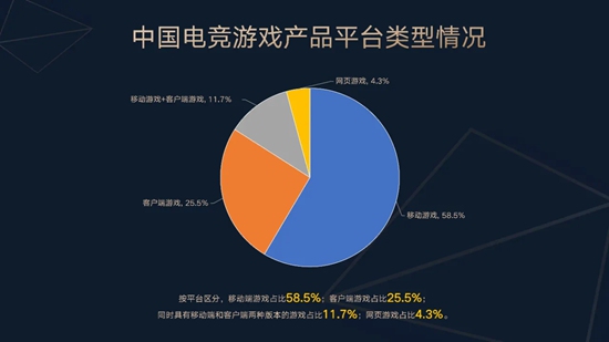 按平台区分,电竞产品中移动端占比最高,为58.5%;客户端次之,为25.5%;两端通用占比11.7%;网页端占比最低,为4.3%。